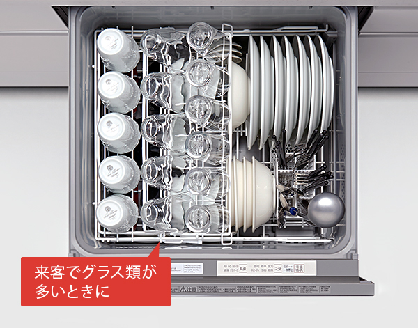 グラスや湯呑みが多い時には、上カゴをフラットにして3列でセッティングできるので、たくさんの食器をスッキリと収納できます。