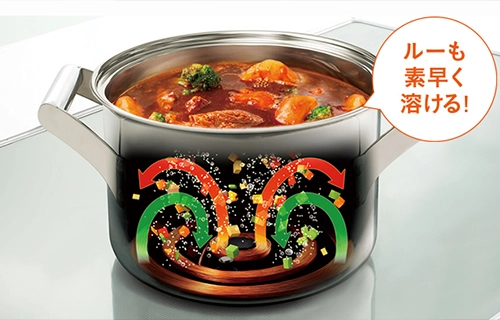 鍋底の内側・外側を交互に加熱することで、鍋の中に対流を起こして自然なかき混ぜ効果を発揮。強火でぐつぐつと煮込んでも焦げつきや煮くずれがしにくく、かき混ぜる手間も軽減します。調理時間が長い、煮込み料理も簡単です。