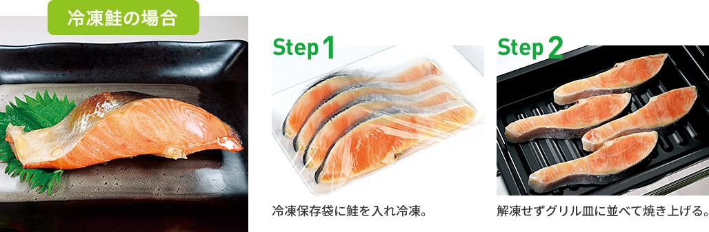 冷凍の切身や鶏肉などをそのまま調理可能。解凍の手間が不要なうえ、グリル皿はセラミックコートだから焼き上がりがよく、波型の底面で余分な脂も落ちておいしくヘルシーに仕上がります。
